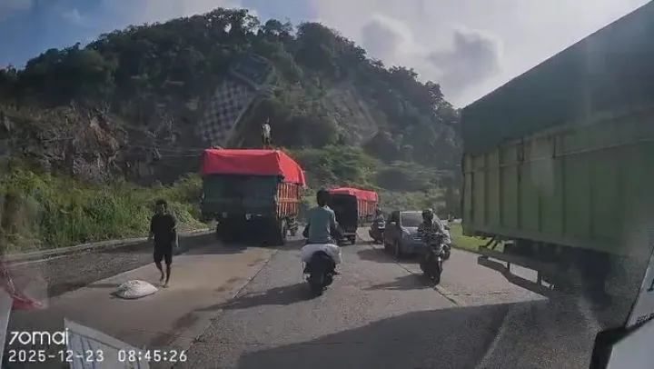 Dalam rekaman video yang diperoleh, tampak seorang pria berdiri di atas truk yang diduga sedang menjatuhkan muatan dari kendaraan yang sedang melaju.