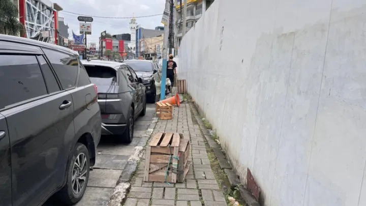 Selain tiang, terdapat deretan cone parkir, kayu, dan tali rafia yang memotong alur jalan. Pejalan kaki harus melangkahi tali, menghindari kayu, atau berhenti sejenak untuk memastikan langkah selanjutnya aman.