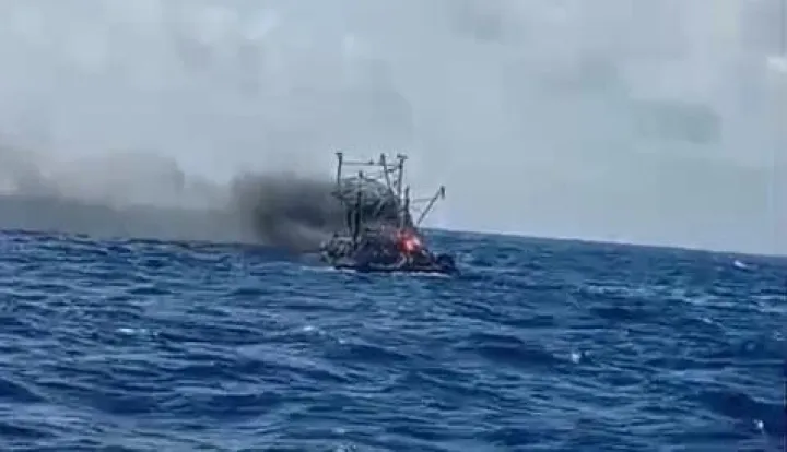 Berdasarkan rekaman video yang beredar, terlihat kondisi kapal tersebut terbakar dengan asap hitam yang membumbung tinggi ke langit.