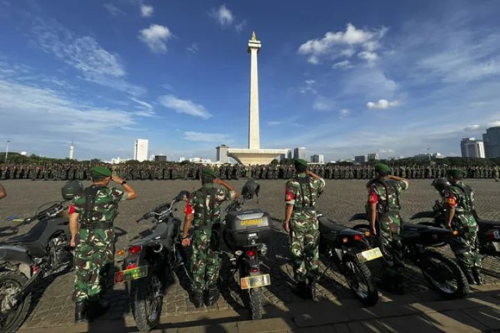 Kodam Jaya bersama Polda Metro Jaya menggelar apel kesiapsiagaan pengamanan Natal 2025 dan Tahun Baru 2026 di kawasan Monas, Jakarta Pusat, Rabu (24/12). Dalam kesiapan tersebut, sekitar 4.500 prajurit disiagakan untuk menjaga kondusivitas Jakarta selama rangkaian perayaan.
