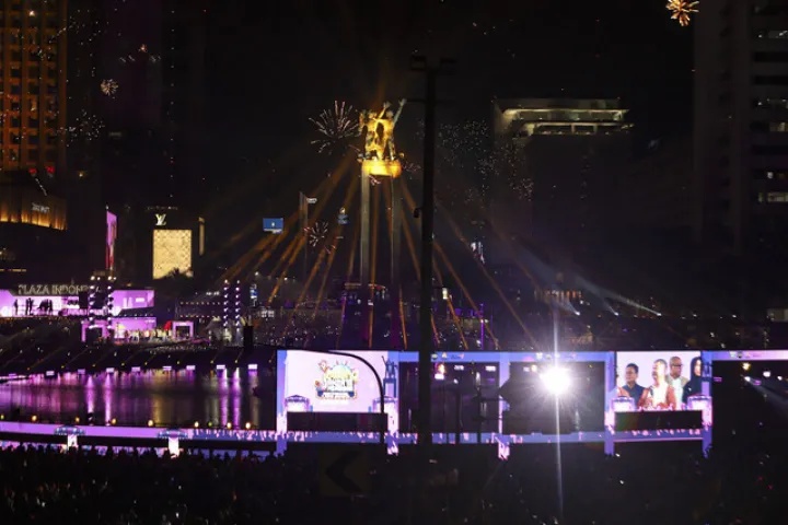Perayaan tahun baru biasanya identik dengan pesta kembang api di berbagai lokasi di Jakarta, termasuk Bundaran HI yang pada tahun 2025 menggelar pesta kembang api seperti terlihat dalam dokumentasi foto.