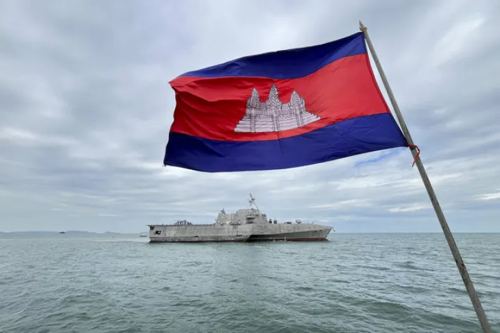 Personel Angkatan Laut Kamboja menyaksikan kapal tempur USS Savannah berlabuh di kota pelabuhan selatan Kamboja, Sihanoukville, pada 16 Desember 2024. Foto: Suy Se/AFP