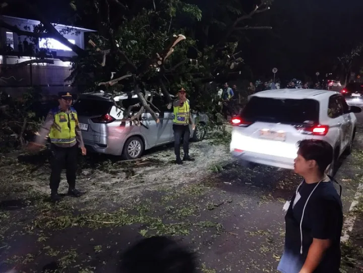Sebatang pohon trembisi di jalur keluar Bandara I Gusti Ngurah Rai, Bali, mengalami tumbangan secara tiba-tiba pada Sabtu (20/12) malam. Batang pohon berukuran besar tersebut jatuh menimpa sebuah mobil Mitsubishi Xpander dan Toyota Avanza Veloz yang sedang melintas di jalan tersebut.