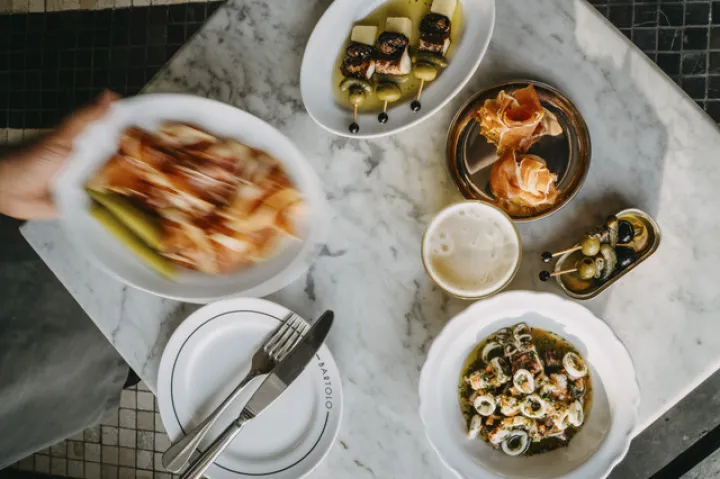 Pengalaman bersantap tamu diawali dengan hidangan bercita rasa Eropa yang kuat; seperti roti dengan bottarga butter, olesan dengan karakter umami dari telur ikan asin. Kemudian disajikan rosette de Lyon, sosis babi kering tradisional. Selanjutnya, ada chicken liver pâté dengan cranberry dan bumbu pelengkap, polenta croquettes dengan parmesan aioli dan jamon serrano, serta gilda yang merupakan hidangan kecil gurih berisi gurita, keju Manchego, tomat kering, dan zaitun.