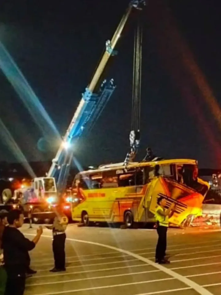 Proses evakuasi Bus PO Cahaya Trans yang mengalami kecelakaan tunggal di Simpang Susun Exit Tol Krapyak Kota Semarang. Foto: Instagram/@relawangabungansemarang