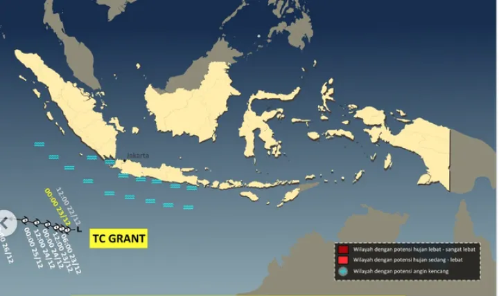 “Terpantau Siklon Tropis Grant berkembang dari Bibit Siklon 93S sejak 11 Desember 2025 di wilayah Samudera Hindia selatan Jawa Timur dan mencapai intensitas siklon tropis pada 23 Desember 2025 pukul 07.00 WIB. Saat ini posisi berada di sekitar Samudera Hindia sebelah selatan Bengkulu,” ungkap BMKG, Selasa (23/12).