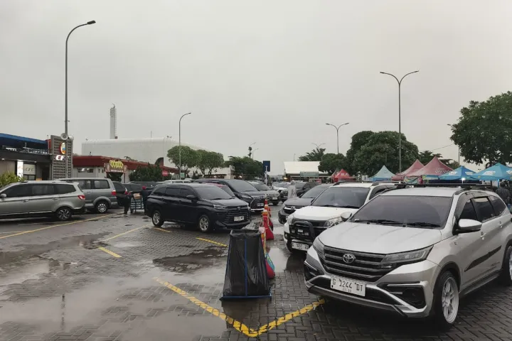 Di Rest Area KM 166 Tol Cipali, hujan dengan intensitas cukup deras sempat mengguyur kawasan tersebut. Meski demikian, aktivitas kendaraan di area parkir terpantau cukup padat tanpa adanya antrean panjang saat masuk ke rest area.